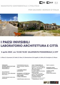 L’evento, organizzato a cura dell’OAPPC_TP e della Fondazione Architetti nel Mediterraneo “Francesco La Grassa”, la Soprintendenza di Trapani- BiblioTP e INSA, con il patrocinio del Comune di Salaparuta e del Comune di Poggioreale, prevede un primo momento narrativo per immergersi nella conoscenza dei luoghi, con l’intervento dell’architetto Giuseppe Verde, la presentazione del libro “I Paesi invisibili” dell’autrice Anna Rizzo, cui seguirà un dibattito e un pranzo conviviale.