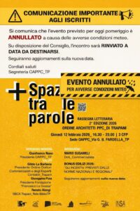 - ANNULLATO EVENTO RASSEGNA LETTERARIA Rassegna Letteraria “+ SPAZIO TRA LE PAROLE” – 2° LIBRO & FOCUS BONUS EDILIZI 2026. TRAPANI_ Sede OAPPC_TP_ giovedì 12 febbraio dalle ore 16:30 alle ore 20:00